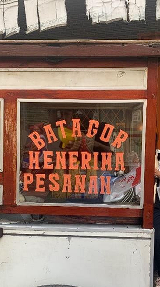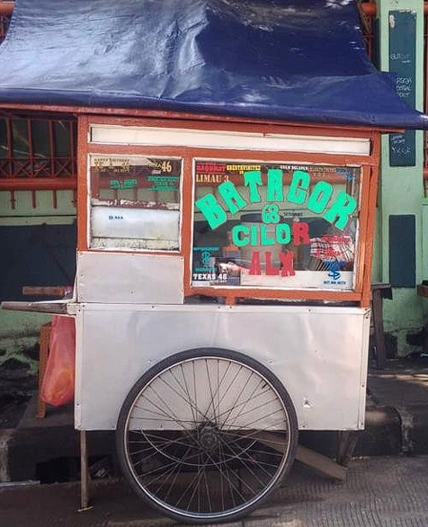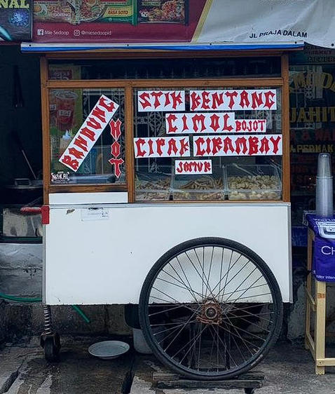 Pada penulisan tipografi sebuah gerobak umumnya menggunakan tipografi Vernakular, fungsi pembuatan visual seperti ini biasanya untuk suatu tanda atau memberitahukan kepada orang-orang yang sedang berkendara atau melewati tempat tersebut tentang adanya identitas dari pedagang kepada Masyarakat. Dituliskan dengan menggunakan tulisan tangan dengan gaya bentuk huruf yang seadanya tanpa adanya suatu grid antar satu sama lain dan seringkali dicap sebagai kesenian rendah dan penuh keterbatasan dalam pembuatanya.
