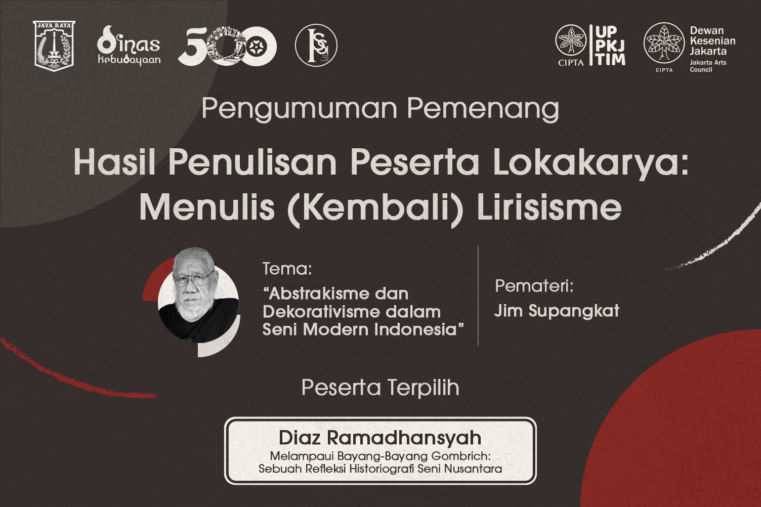 Namun, jika kita duduk cukup lama di depan layar, menyimak Jim Supangkat membongkar arsip ingatannya, saat ia berbicara di bawah tajuk besar “Abstrakisme dan Dekorativisme dalam Seni Modern Indonesia” pada lokakarya yang diinisiasi oleh Dewan Kesenian Jakarta dan Dinas Kebudayaan, 30 November 2025 lalu, ilusi tentang garis lurus itu perlahan bengkok. Ia patah, retak, dan akhirnya melingkar kembali ke titik awal.